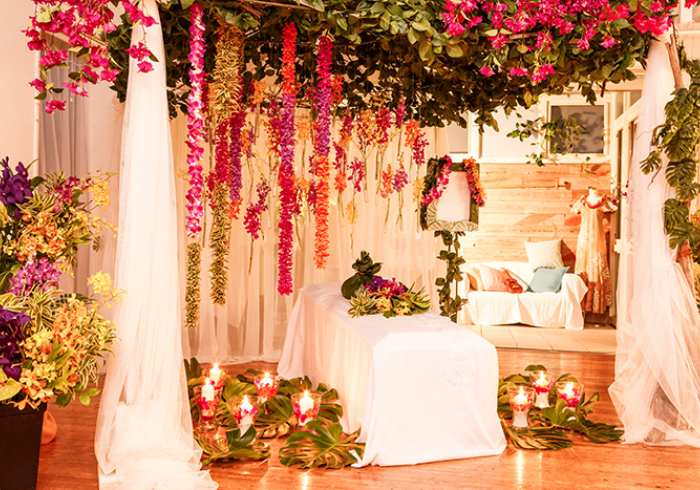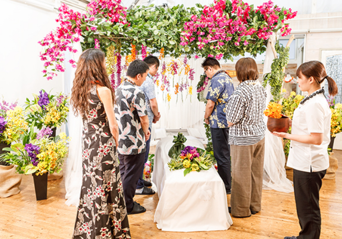 ハワイへの憧憬を彩るフラワーデザイン祭壇。